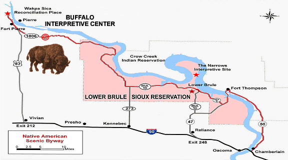 The Center is located one of the tribal bison ranges on original Lower Brule Sioux Reservation lands. More than 100 buffalo roam freely through the hills, plains and draws of this native shortgrass prairie. Hands-on exhibits, interpretive videos, special programs and tours of the buffalo pasture offer visitors a unique educational experience that enhances cultural understanding. The gift shop offers a wide selection of products of native artisans. Demonstrations of traditional Lakota arts and crafts techniques take place periodically. The Center is just 7 miles SE of Ft. Pierre on the Native American Scenic Byway (Hwy 1806) - the beautiful and dramatic alternative route for travelers to Pierre and beyond from Interstate 90 East!